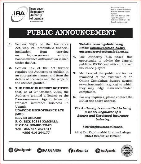 Ugafode Microfinance Limited has received clearance from the Insurance Regulatory of Uganda (IRA) to sell insurance under the bancassurance arrangement.